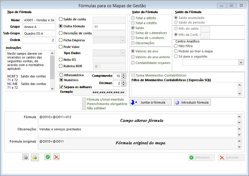- Fórmula (original): novo campo onde é guardada a fórmula original da célula quando esta é alterada. Se o utilizador se enganar, poderá copiar a fórmula neste campo para a fórmula atual.