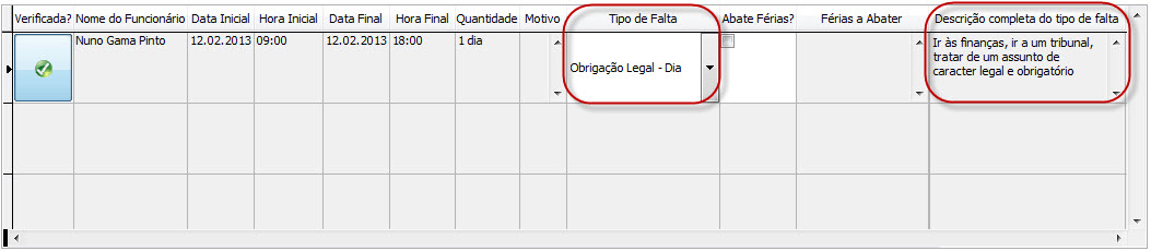 Descrição completa do tipo de faltaEste campo apresenta a descrição completa do Tipo de Falta selecionada, ou seja, consoante o Tipo de Falta selecionada a aplicação atualiza automaticamente o campo Descrição completa do tipo de falta.