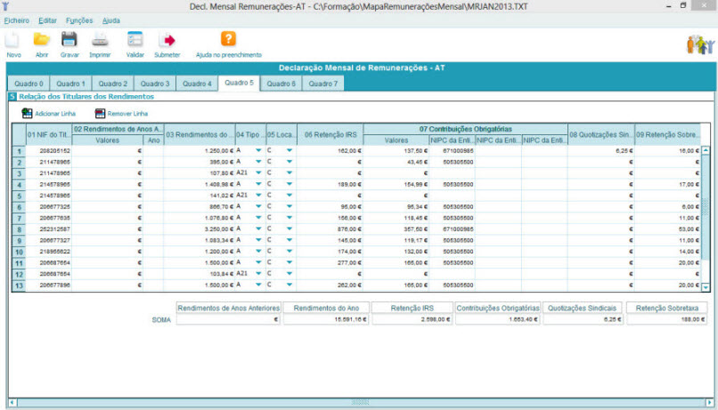 É importante salientar que poderão existir várias linhas para o mesmo Sujeito passivo tendo em conta que a Declaração mensal de remunerações divide a relação de rendimentos em diferentes categorias (Rendimentos sujeitos, Rendimento isentos sujeitos a englobamento e Rendimentos não sujeitos) com vários códigos para cada categoria.