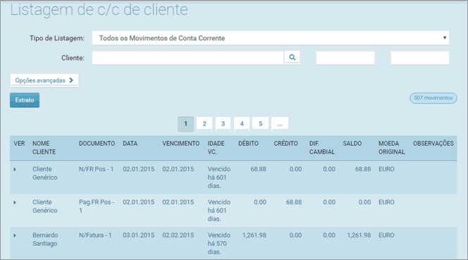 Permite ao utilizador consultar a Listagem de c/c de Cliente de forma rápida. Podendo posteriormente, consultar o extrato, definir uma pesquisa de movimentos entre datas e navegar para visualizar os documentos de origem.